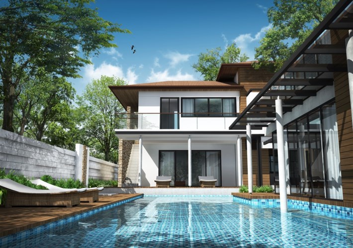 Dom posiada basen i pięknie urządzone, nowoczesne wnętrza.